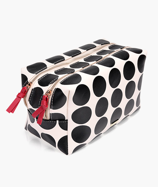 Make a bold beauty statement with this playful double-zip cosmetic bag from the Queen of Hearts collection. Designed in a striking black-and-white polka dot print with vibrant red zipper pulls, it blends pop-art flair with everyday functionality.